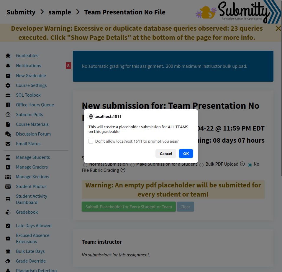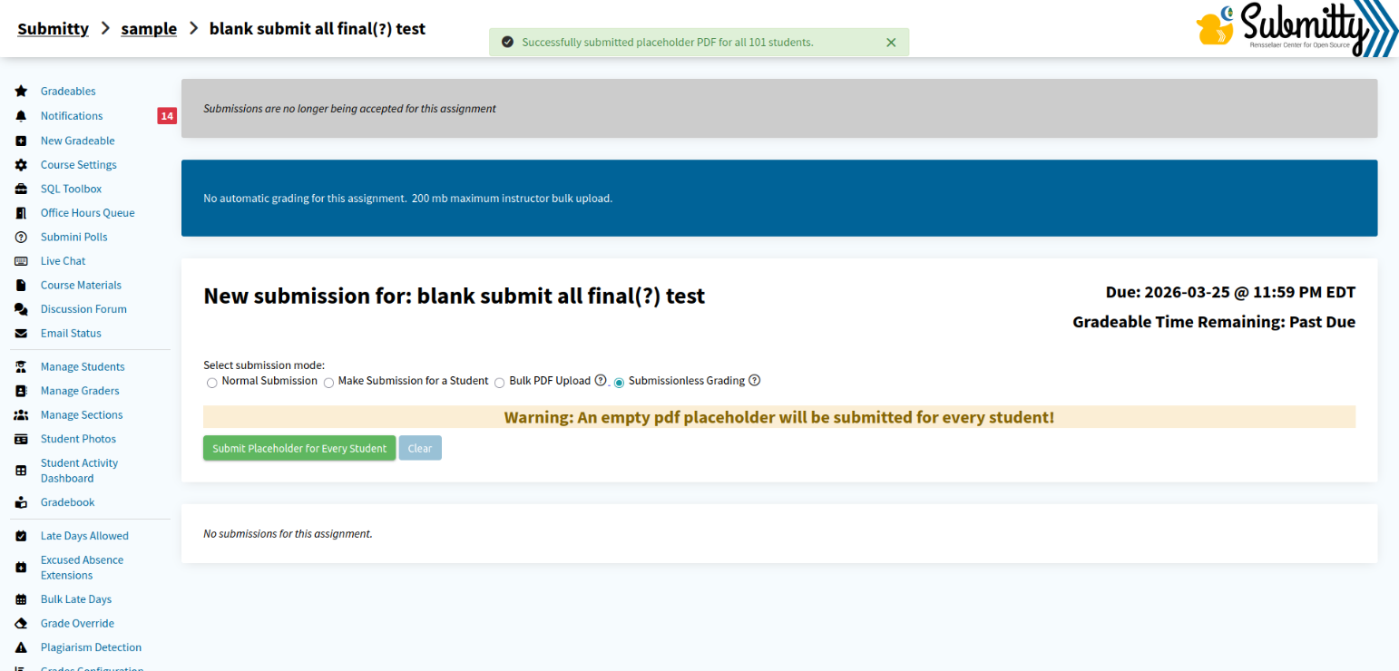 Click “Submit Placeholder for Every Student”: This will actually submit the pdf placeholders for every student on the gradeable. After confirming, a message will appear at the top of the screen displaying the successful number of submissions made.